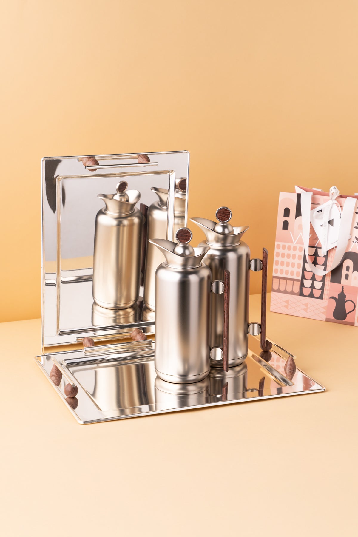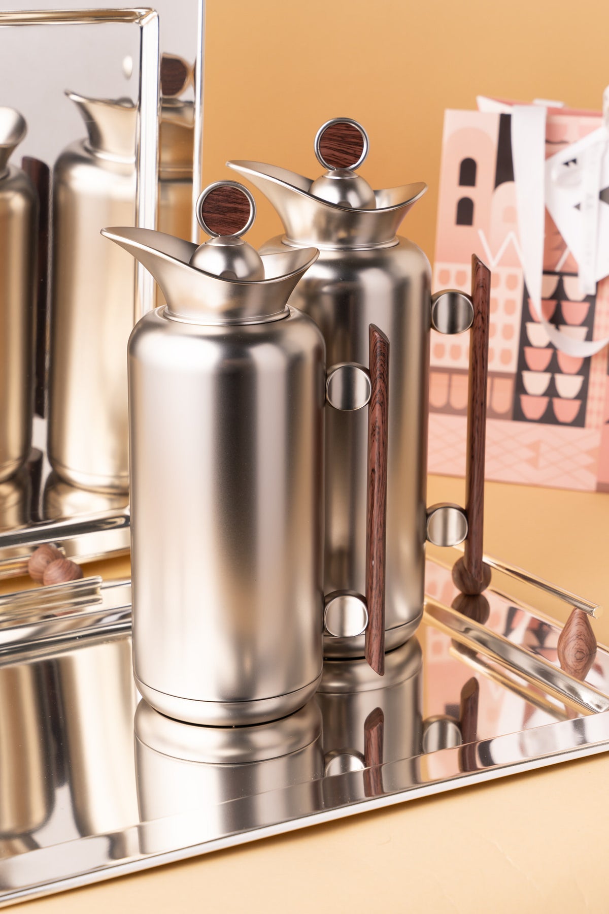 طقم مطارات ارام 2 قطعة 1 لتر / 0.7 لتر - فضي مطفي / مسكه خشبي