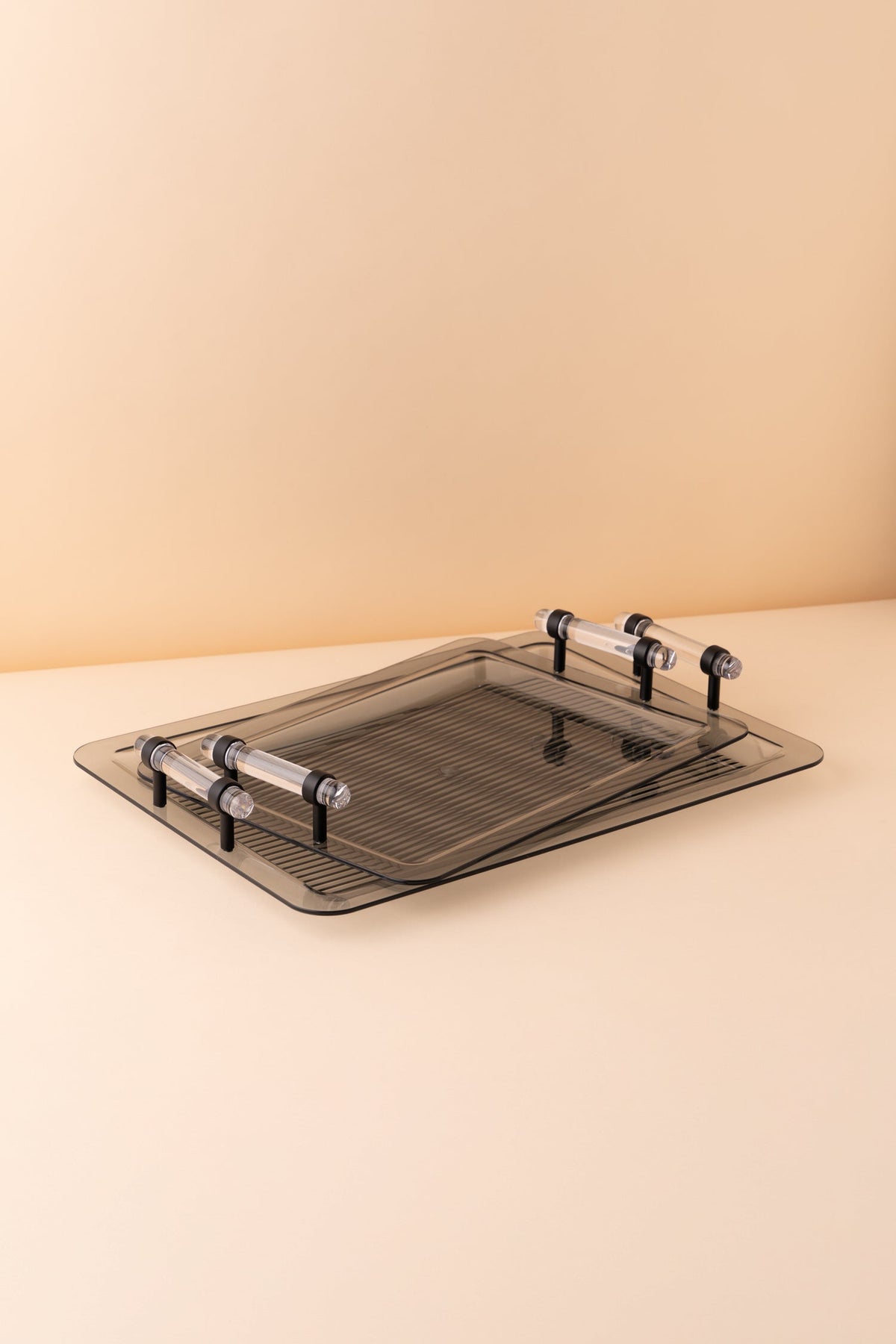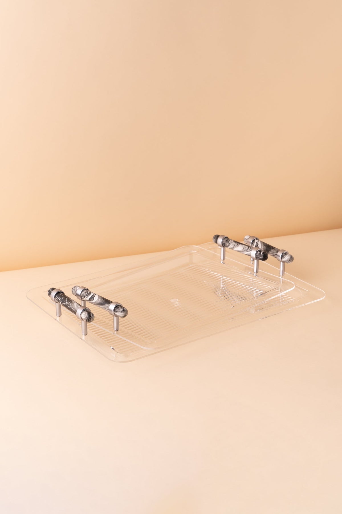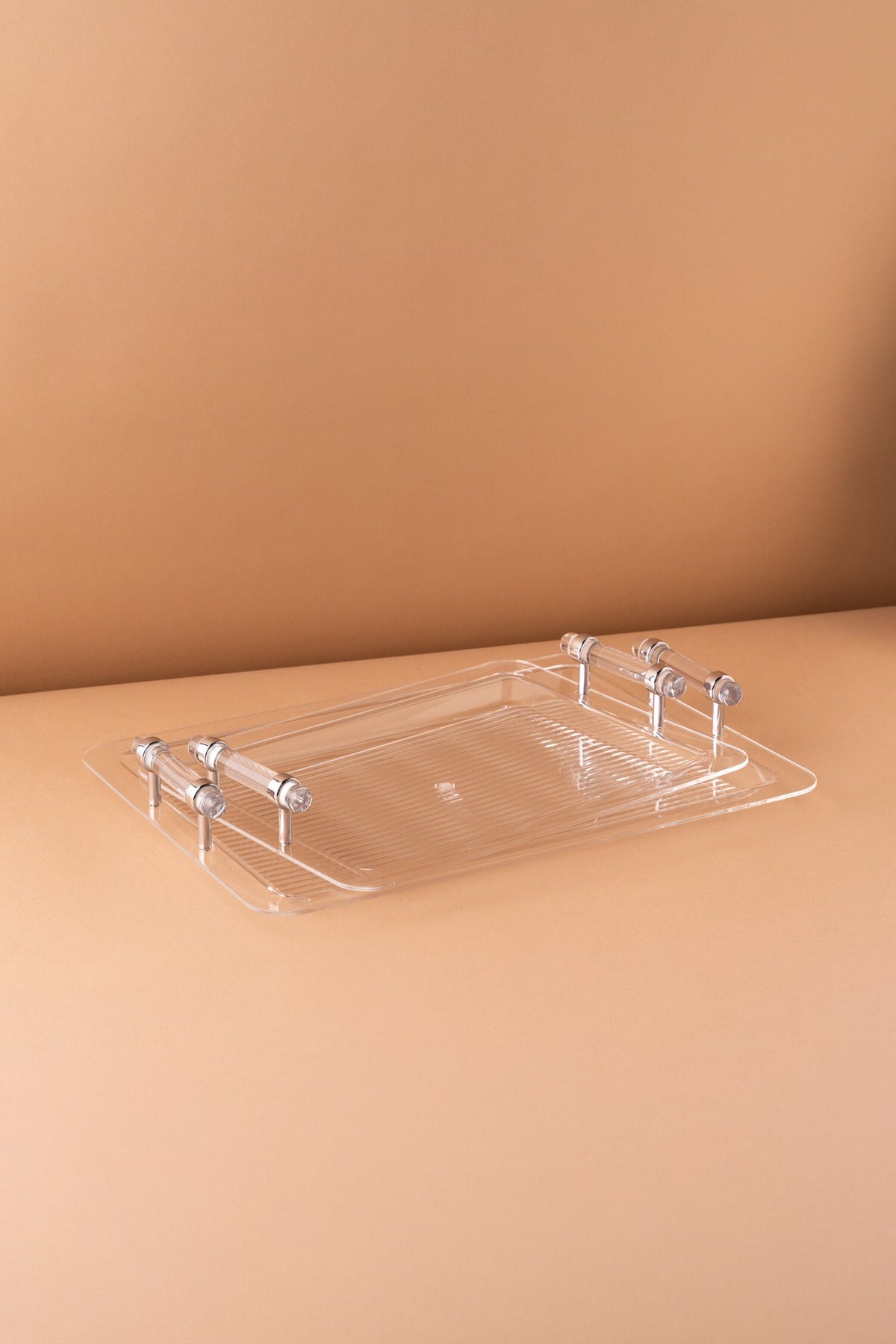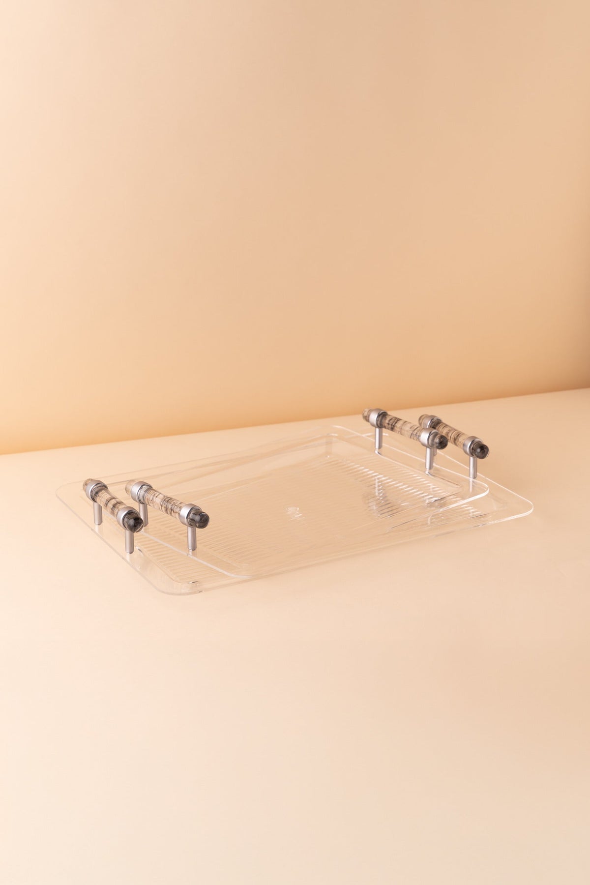 Rectangular acrylic serving tray set consists of 2 pieces.