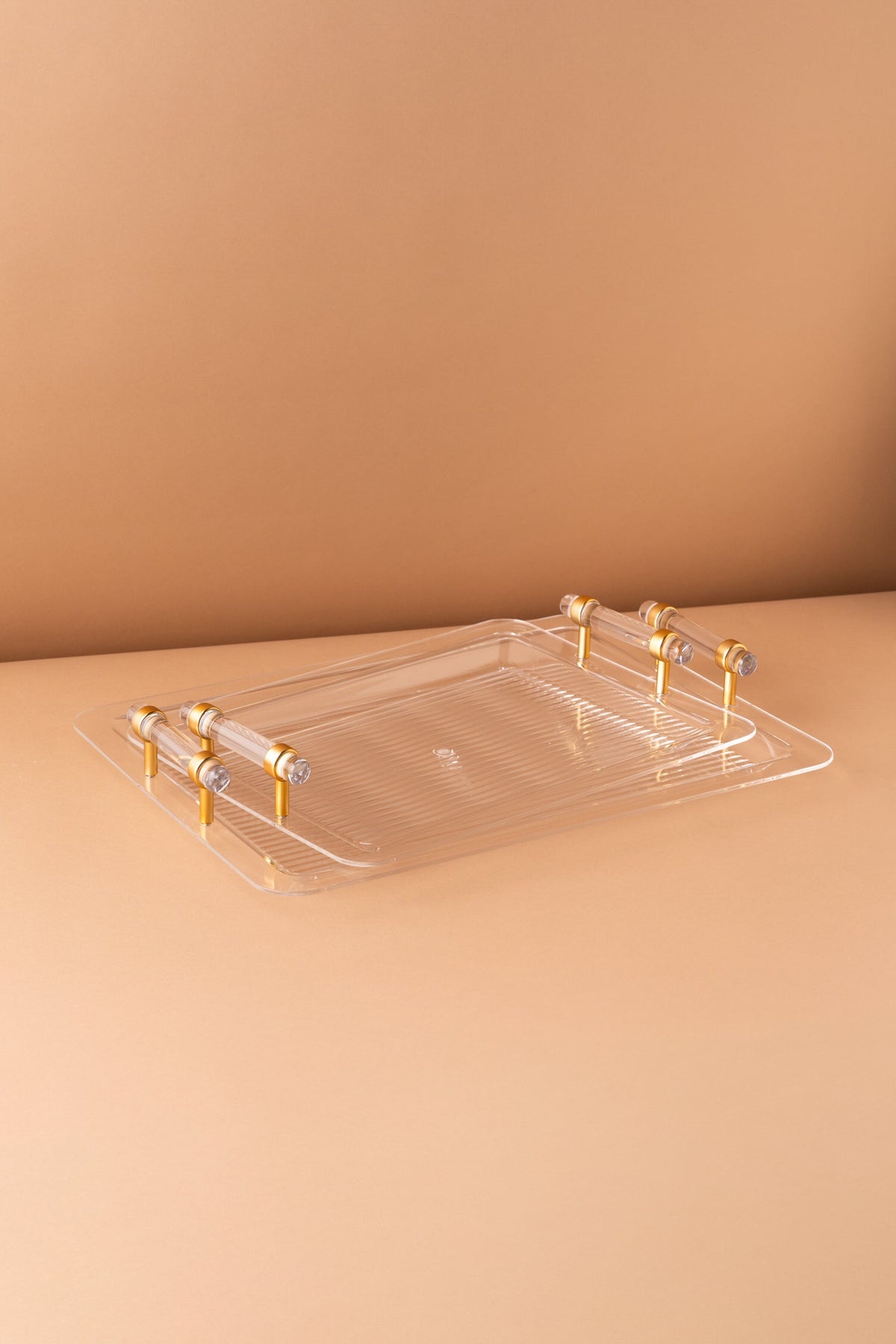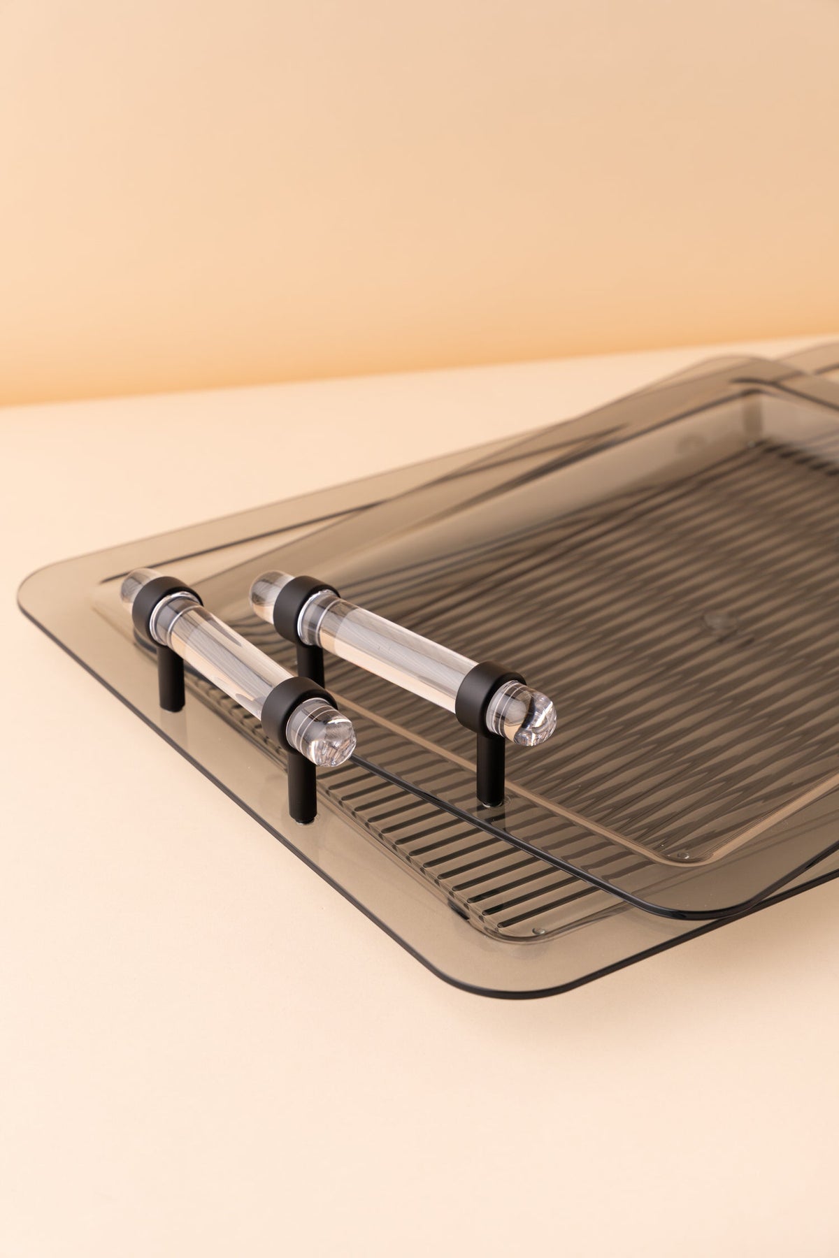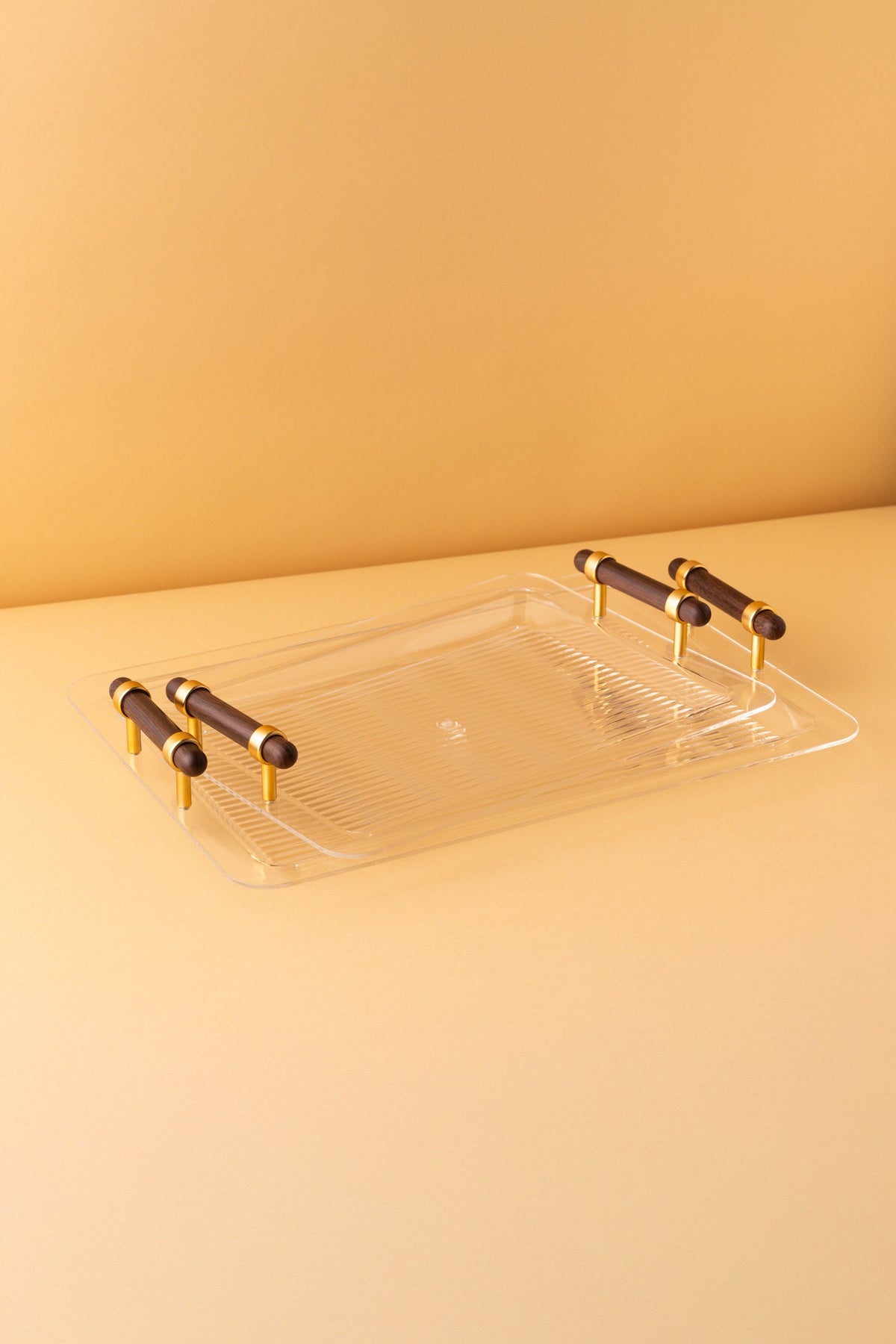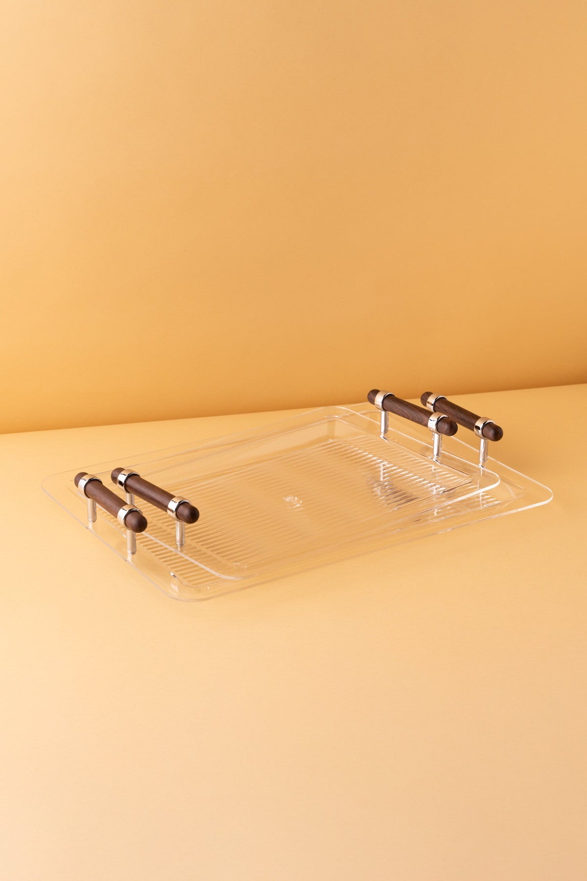 Rectangular acrylic serving tray set consists of 2 pieces.