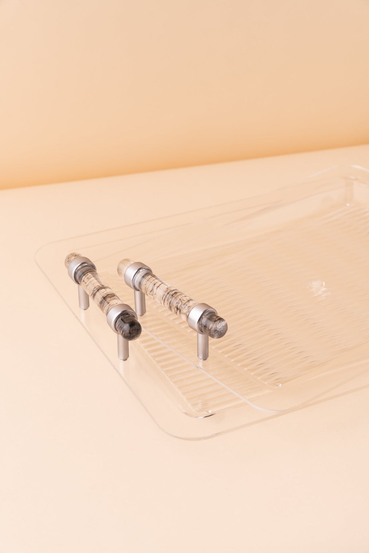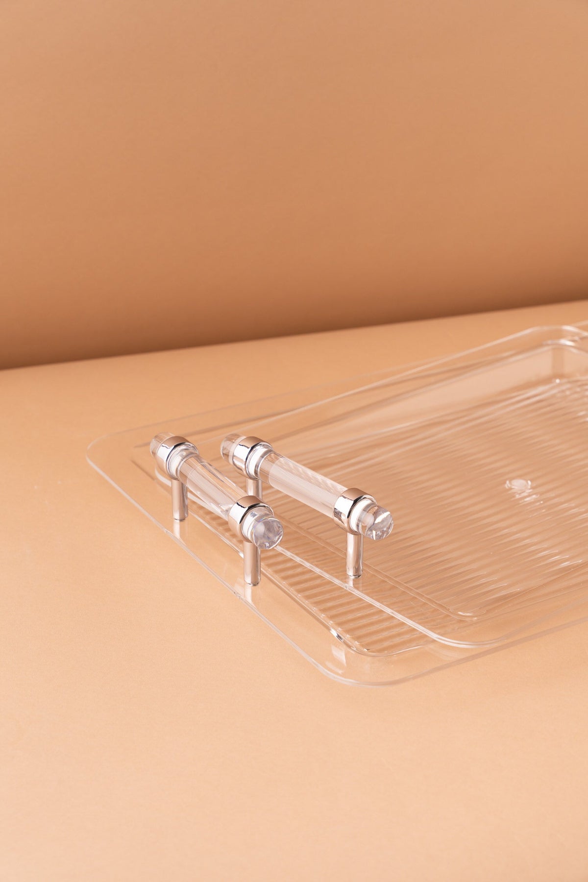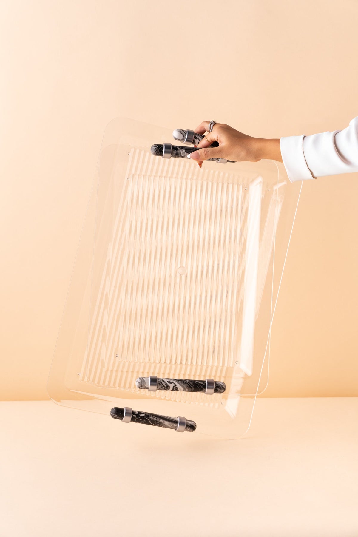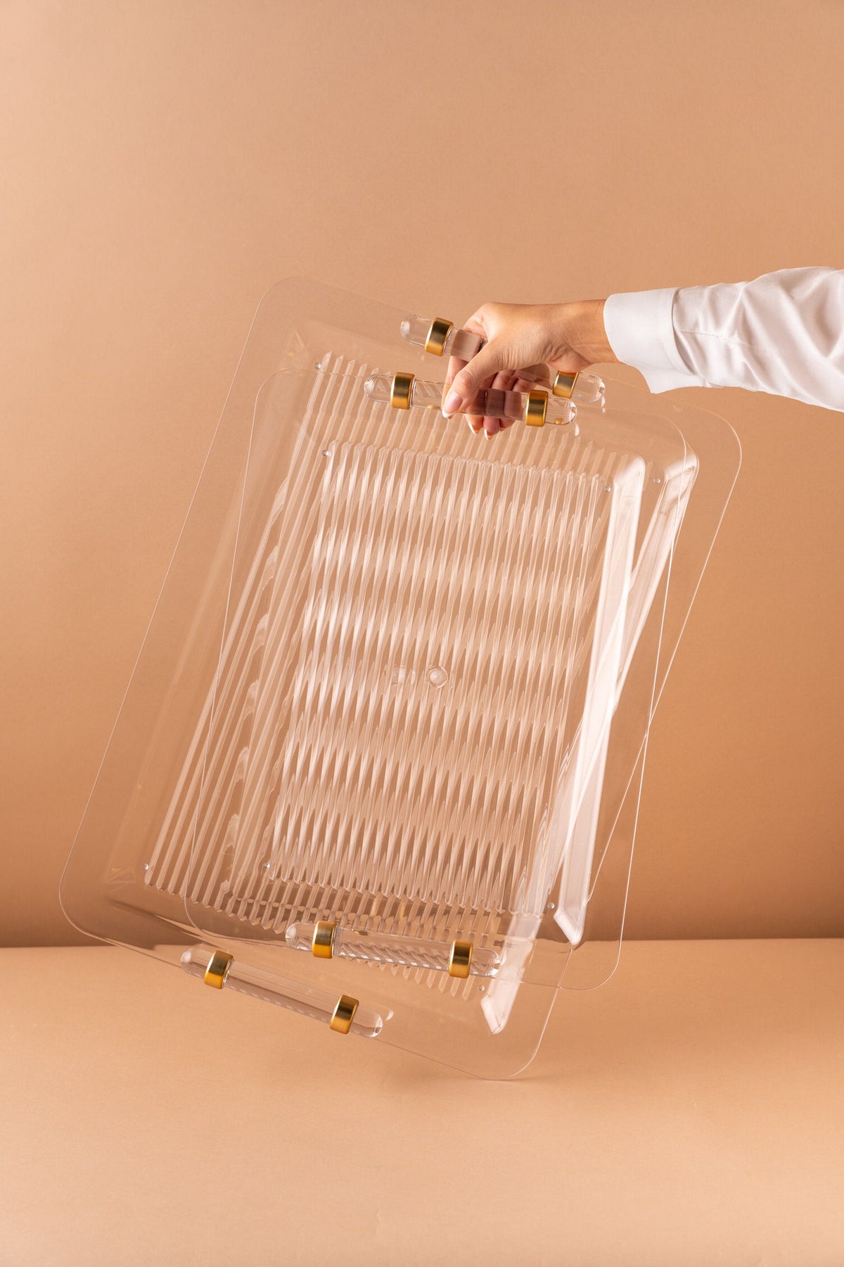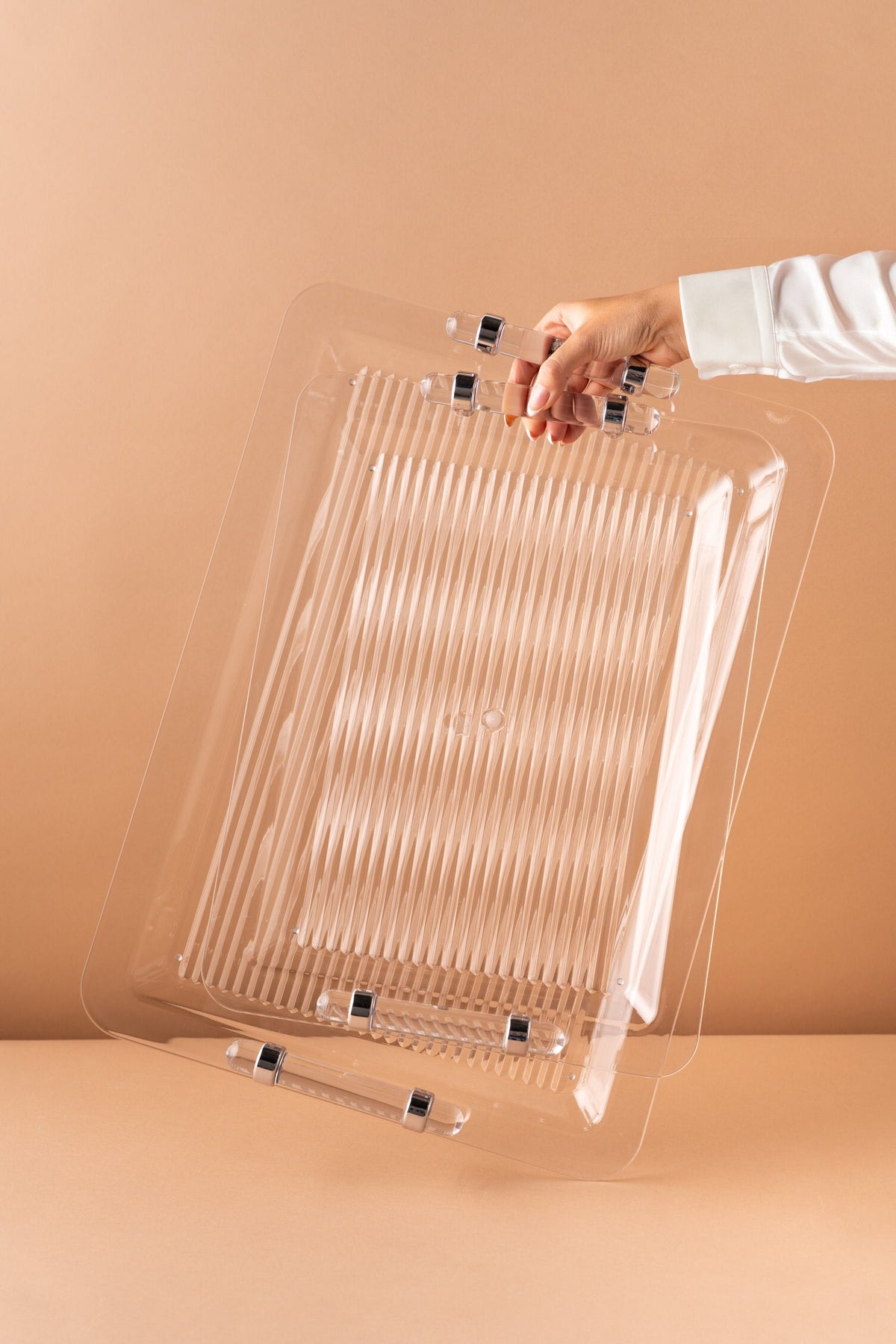 Rectangular acrylic serving tray set consists of 2 pieces.